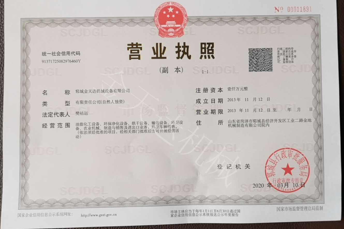 郓城金天达机械设备有限公司主要经营范围:油脂化工设备、环保净化设备、烘干设备、输送设备、环卫设备、农业机械、制造与销售及进出口业务;环卫车辆销售。